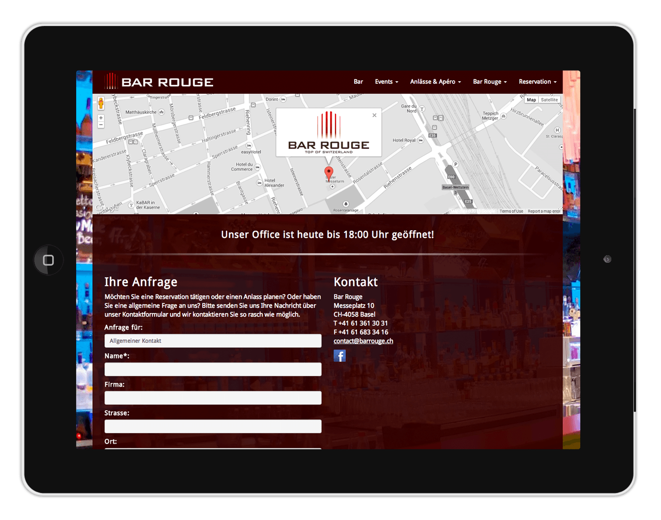 - Die verschiedenen Öffnungszeiten sind in Echtzeit verfügbar: auf der Start- sowie der Kontaktseite ist ersichtlich, ob die Bar Rouge gerade geöffnet ist, und falls nicht, wann sie wieder geöffnet sein wird