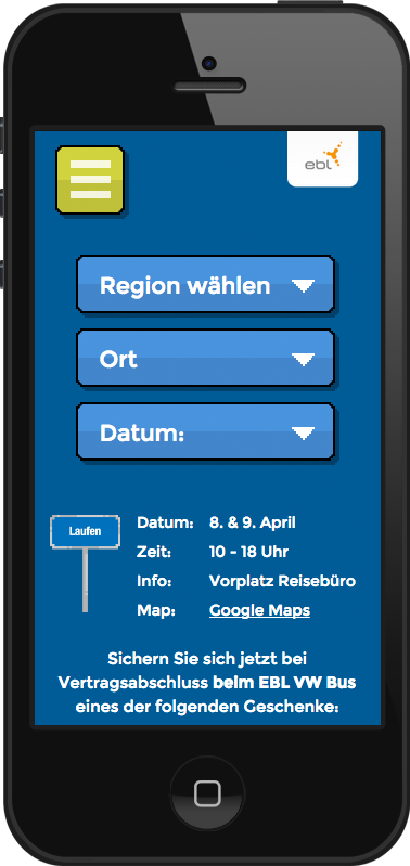 Für die Bekanntmachung und Information rund um die Roadshow «On Tour» der Elektra Baselland soll eine Microsite erstellt werden. An der Roadshow macht ein VW-Bus im Zielgebiet Halt und zeigt sein Angebot vor Ort der interessierten Bevölkerung. Über die beiden integrierten Wettbewerbe lassen sich attraktive Preise gewinnen.