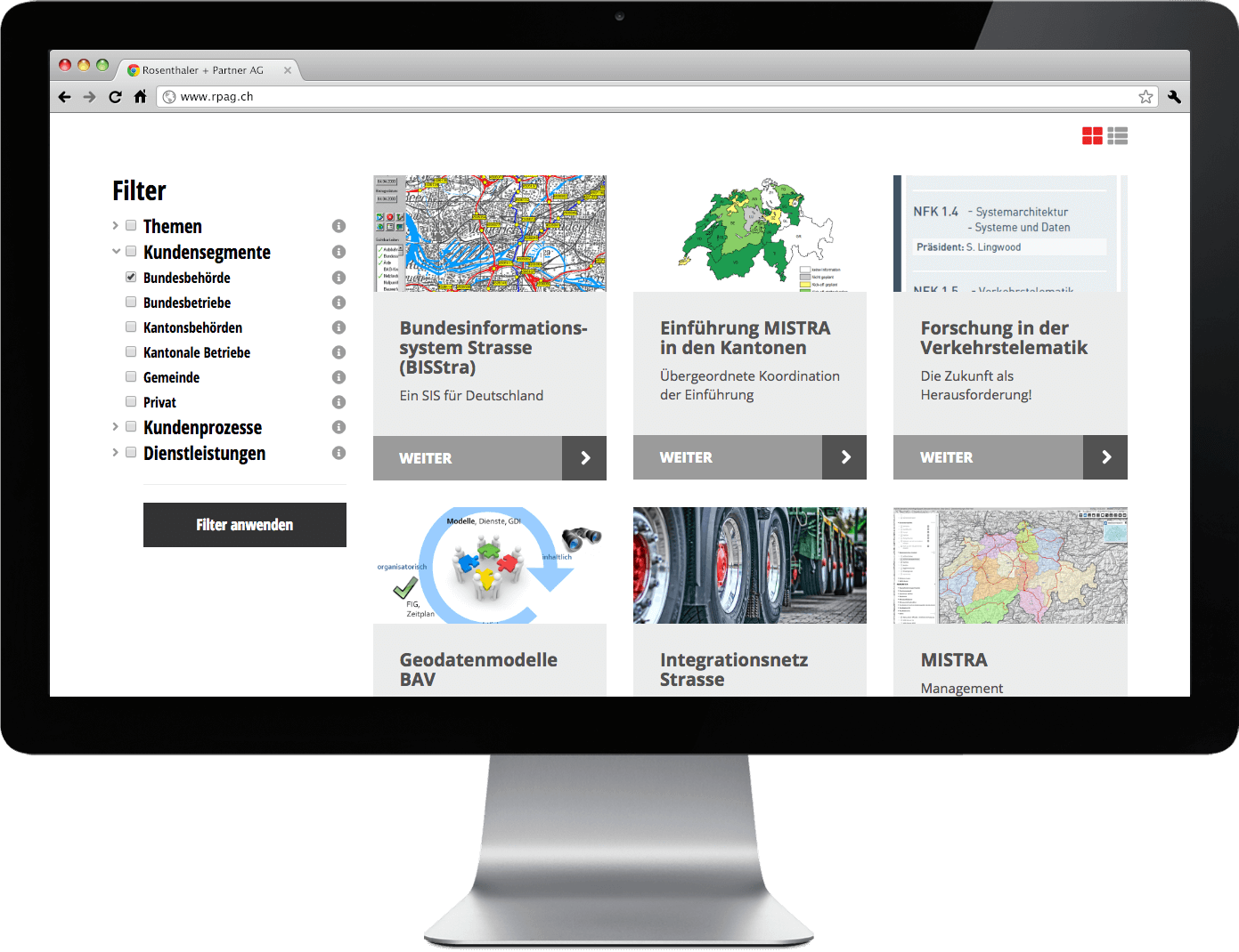 Der «Knackpunkt» der Umsetzung für unsere Webagentur liegt darin die Referenzprojekte und das Angebot inhaltlich zu verbinden. Hierfür wurden mehrere Konzepte geprüft und schliesslich eine Projektübersicht mit Filtermechanik gewählt.