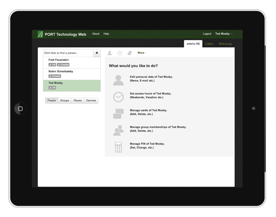 Mit «PORT Technology Web» hat die Webagentur arteria aus Basel eine Web-App realisiert, die hauptsächlich auf die Nutzung via iPad ausgerichtet ist. Nachdem das gewünschte Gebäude vom Anwender ausgewählt wurde, selektiert er im nächsten Schritt die entsprechende Person oder Gruppe für die anschliessende Zutrittsverwaltung.