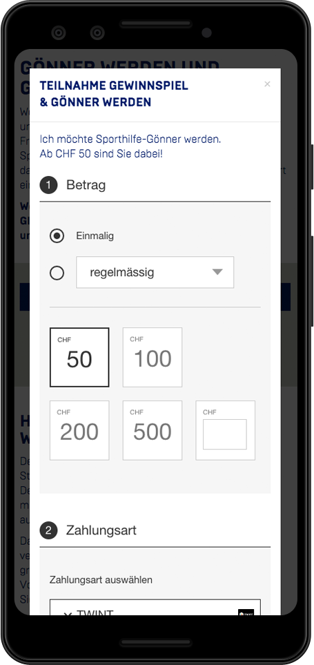 Das Kernstück der Lösung im Responsive Design bilden die Teilnahme-Formulare. Neugönner können dabei den gewünschten Betrag direkt mit dem eingebetteten RaiseNow-Widget begleichen.