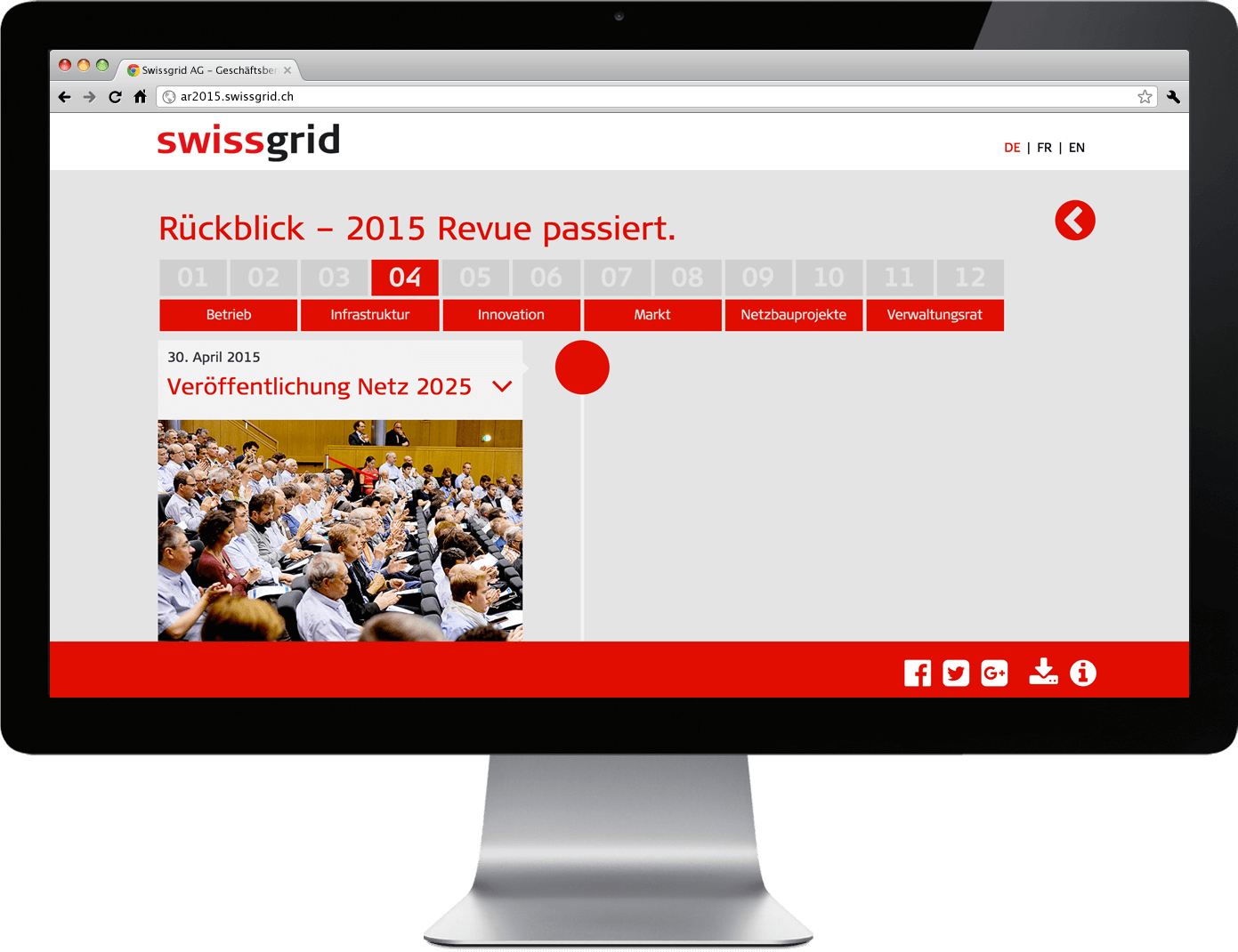 Für den Geschäftsbericht 2015 soll eine Microsite die Kennzahlen der Swissgrid AG interaktiv präsentieren. Zudem wird die Zusammenarbeit mit ausgewählten Stakeholdern, wie z.B. die ETH Zürich, näher beleuchtet. Die individuellen Herausforderungen und Lösungen die es dabei zu meistern gilt, stehen im Mittelpunkt der Konzeption und werden dem Besucher leicht verständlich vermittelt.